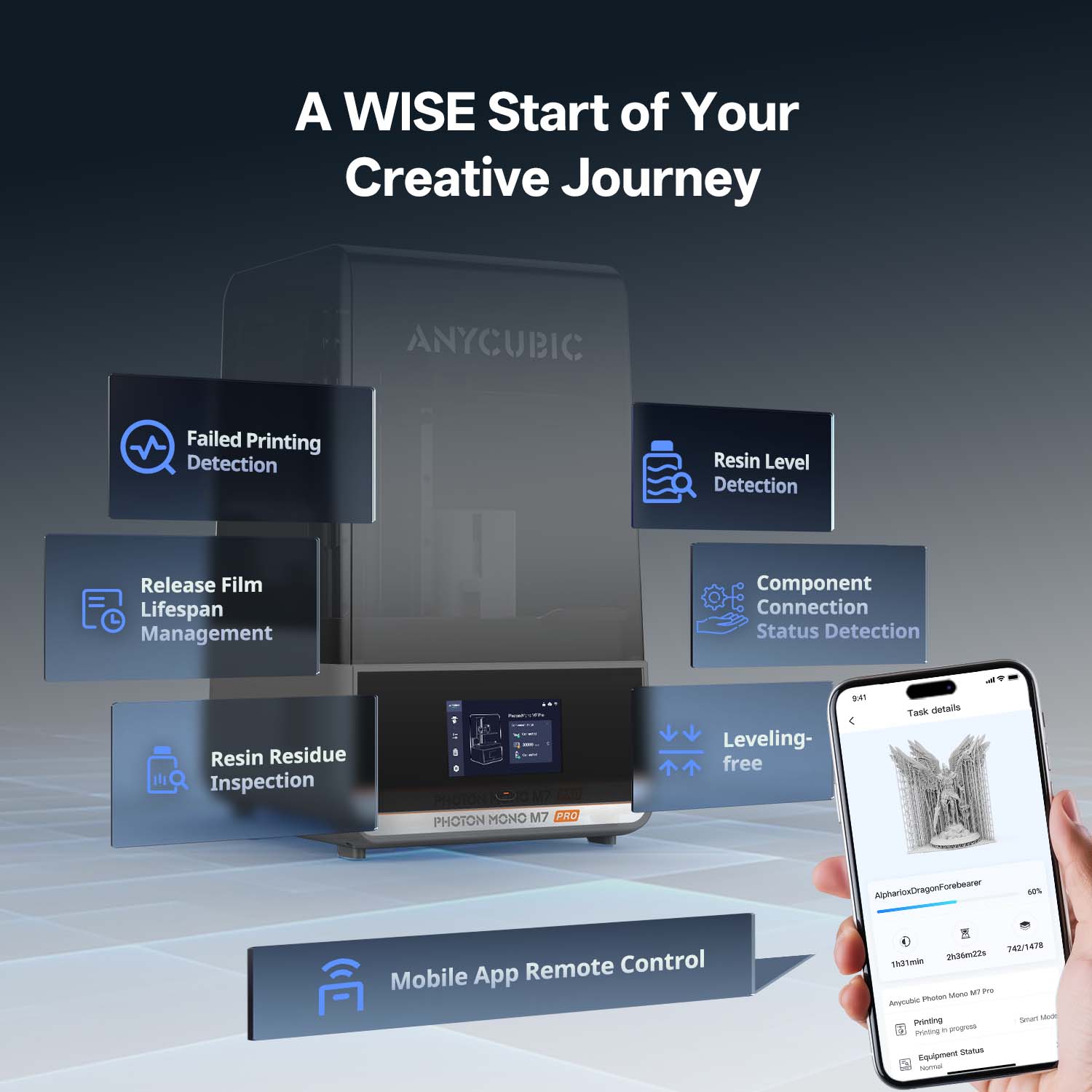 | Smart Detection | Failed print, resin residue, resin level, film lifespan reminders |